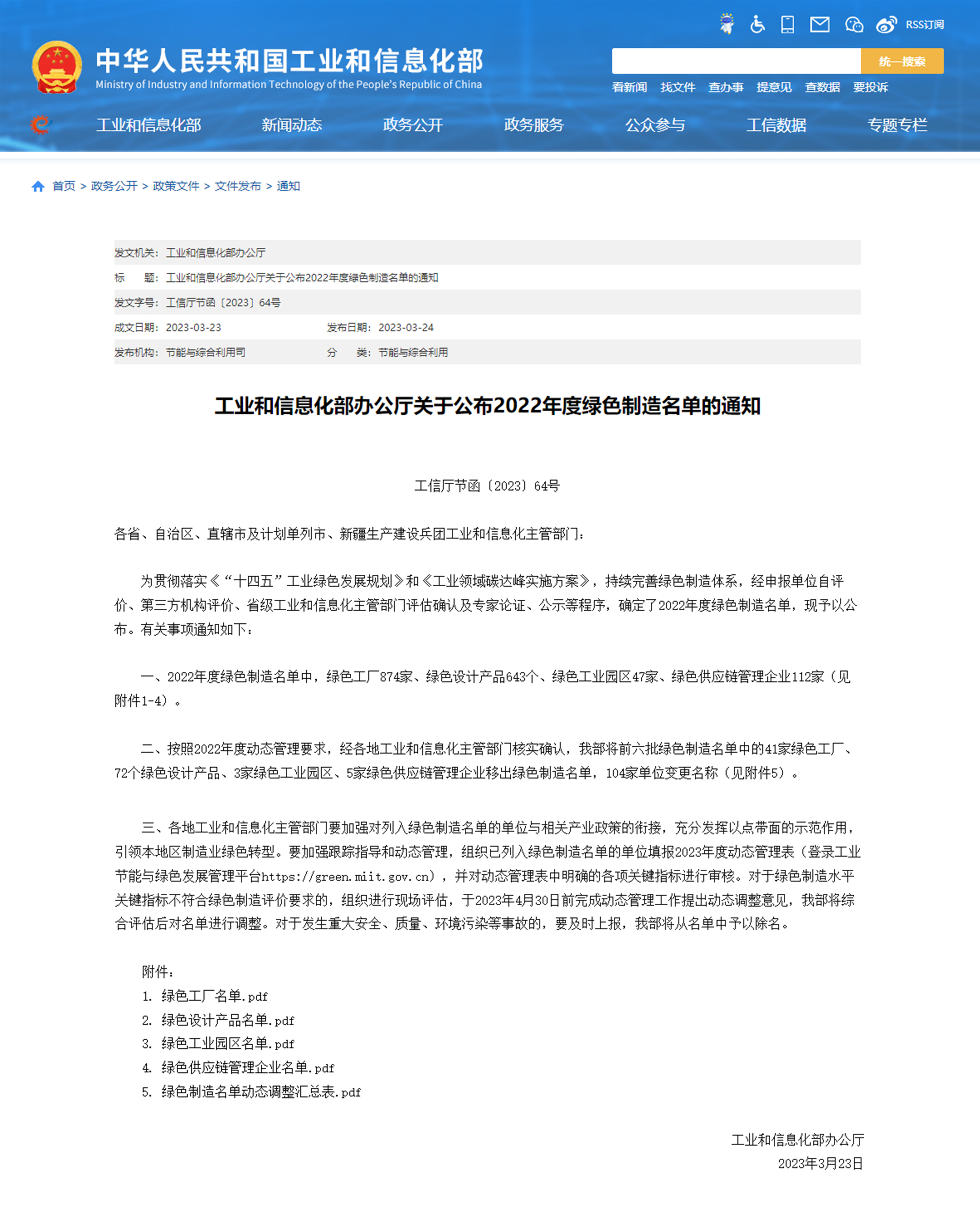 近日,國家工業(yè)和信息化部發(fā)布的《關(guān)于公布2022年度綠色制造名單的通知》,佛山市金銀河智能裝備股份有限公司(以下簡稱“公司”)入選“綠色供應(yīng)鏈管理企業(yè)”名單。