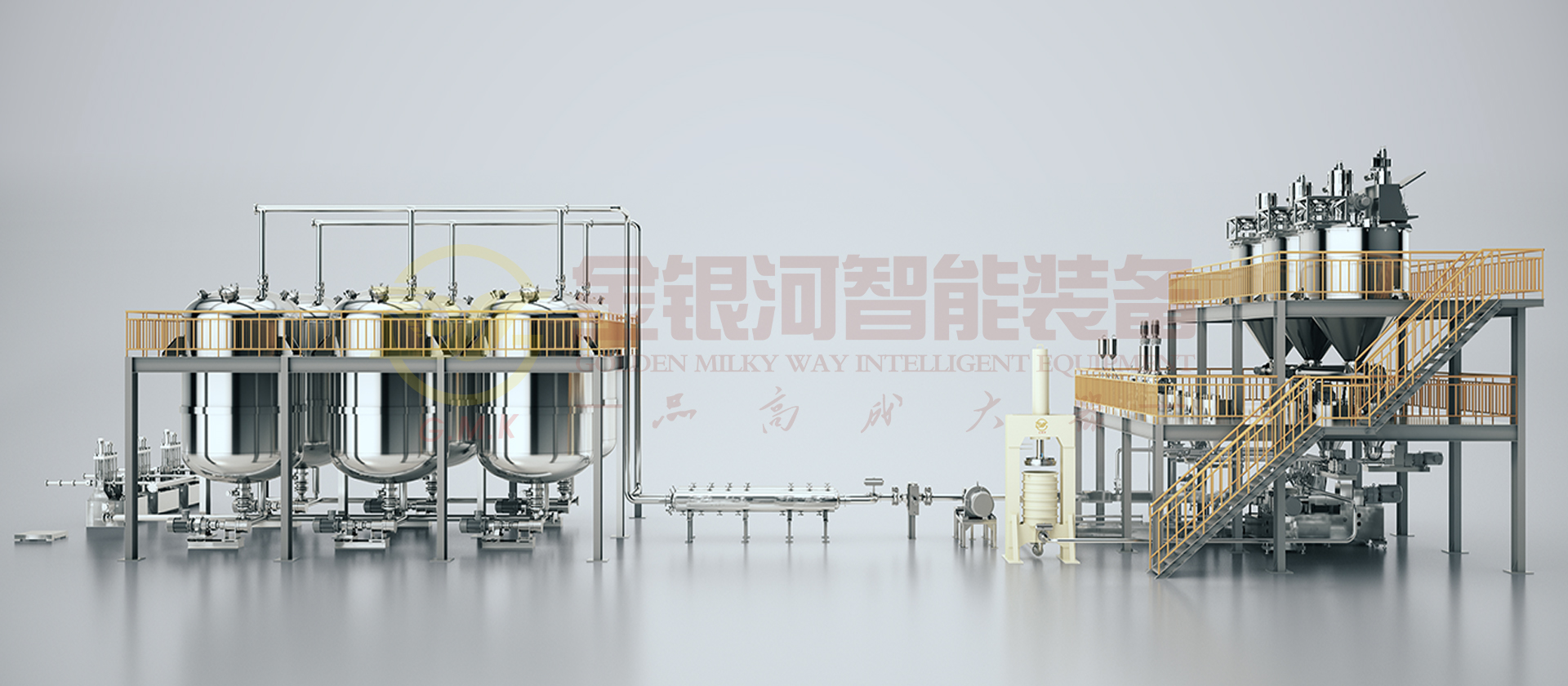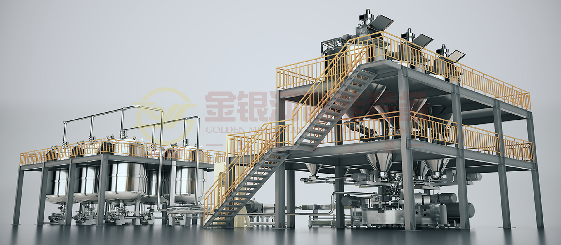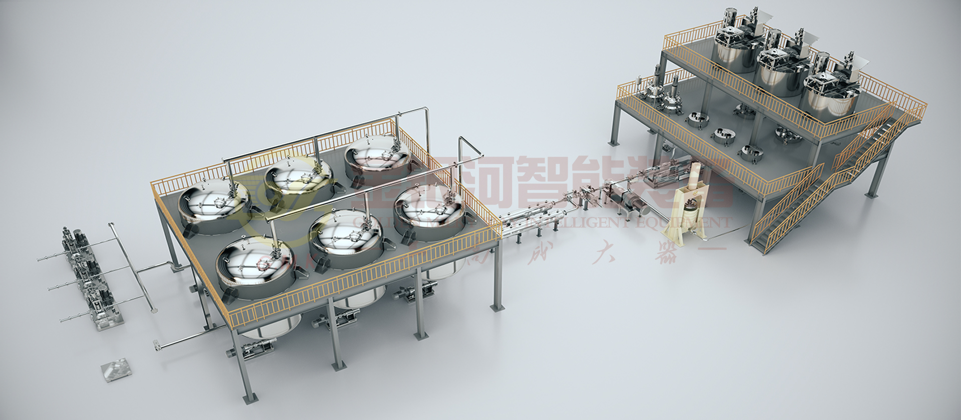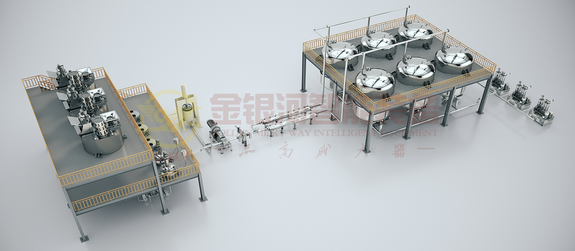 由計量斗、稱量及輸送系統(tǒng)、貯罐、冷卻器、多工位出料機、喂料機、雙螺桿螺旋混合機、輔助設(shè)備及DCS中央控制系統(tǒng)組成。原材料(粉體與液體)通過精確的計量系統(tǒng)在線自動和連續(xù)輸送到螺旋混合機中,在一階雙螺桿螺旋混合機中完成粉液完成混合、分散、研磨、抽真空,并通過在線加入助劑至其中,并輸出進入貯罐暫存,后段接靜態(tài)混合機即可完成MS膠產(chǎn)品輸出。它的生產(chǎn)效率高,適合大規(guī)模生產(chǎn);它具有自動化程度高,杜絕物料直接接觸空氣,產(chǎn)品質(zhì)量穩(wěn)定性好,物料及能源損耗少等優(yōu)點。