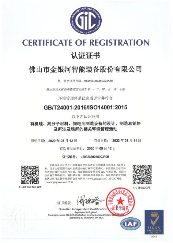 2020年5月,金銀河“環(huán)境管理體系”完成評審并符合GB/T24001-2016/ISO 14001:2015,認證范圍包括有機硅、高分子材料、鋰電池制造設備的設計、制造和銷售及所涉及場所的相關職業(yè)健康安全管理活動。